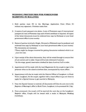 As well as the couple getting married the witnesses are also required to bring their identity card or passport. Two visits to the National Registration Department are necessary in order to submit an application. If you failed to register your foreign marriage with the Registrar of Marriages in Malaysia or abroad within six 6 months after the date of such marriage you will have to pay a penalty of RM10000 for first year and RM5000 for subsequent year upon application to the Registrar.